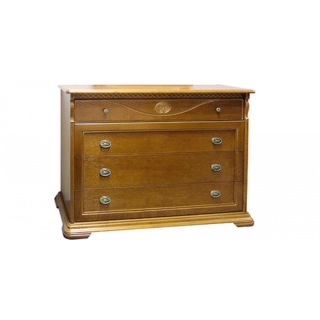 Как и другие изделия коллекции Лика, комод изготовлен из массива и шпона дуба, отличается элегантным видом, качественной отделкой и идеальными пропорциями, благодаря чему легко украсит любой интерьер. Выполнен в цвете "Медовый дуб с золотой патиной".