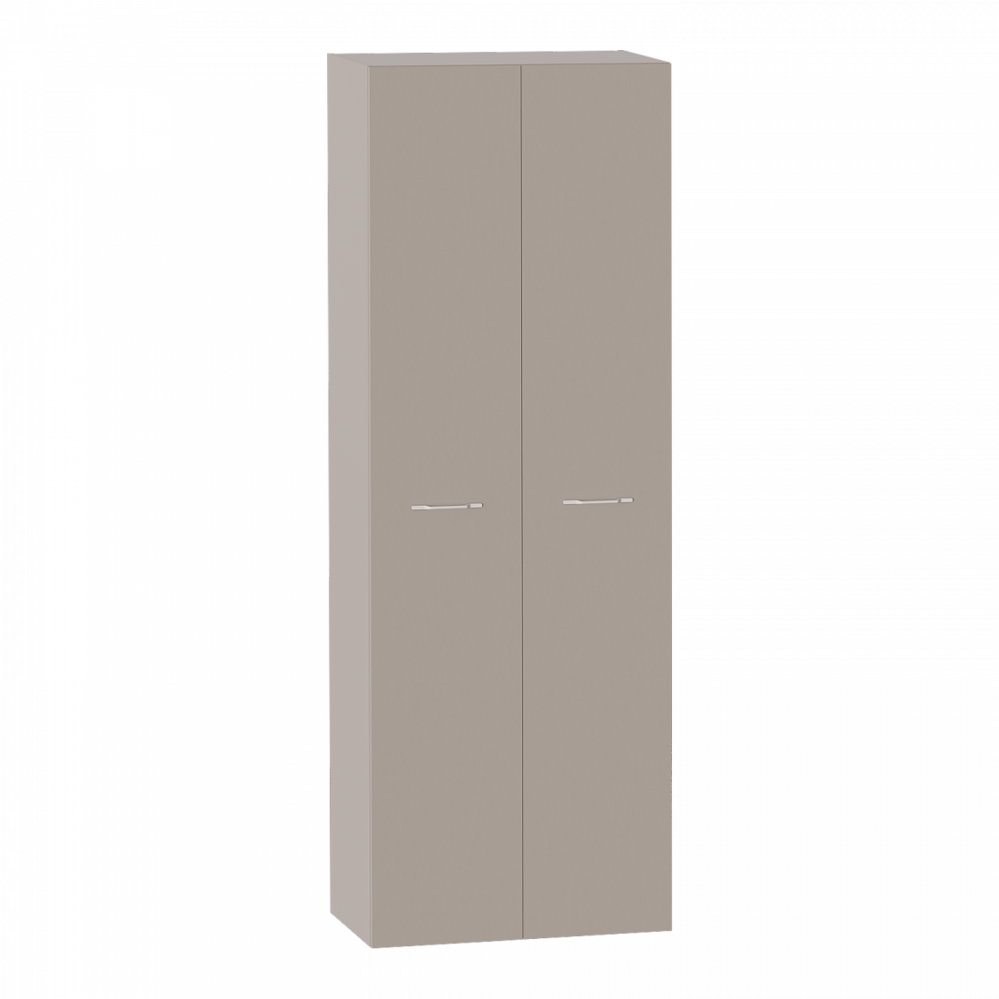 Шкаф двухдверный выполнен из ЛДСП цвета Капучино и имеет 2 вместительных полки в верхней части шкафа, 4 полки в правой части, и штангу для одежды на плечиках - в левой. Ручки в форме скобы выполнены из белого матового металла. Все петли - плавного закрывания