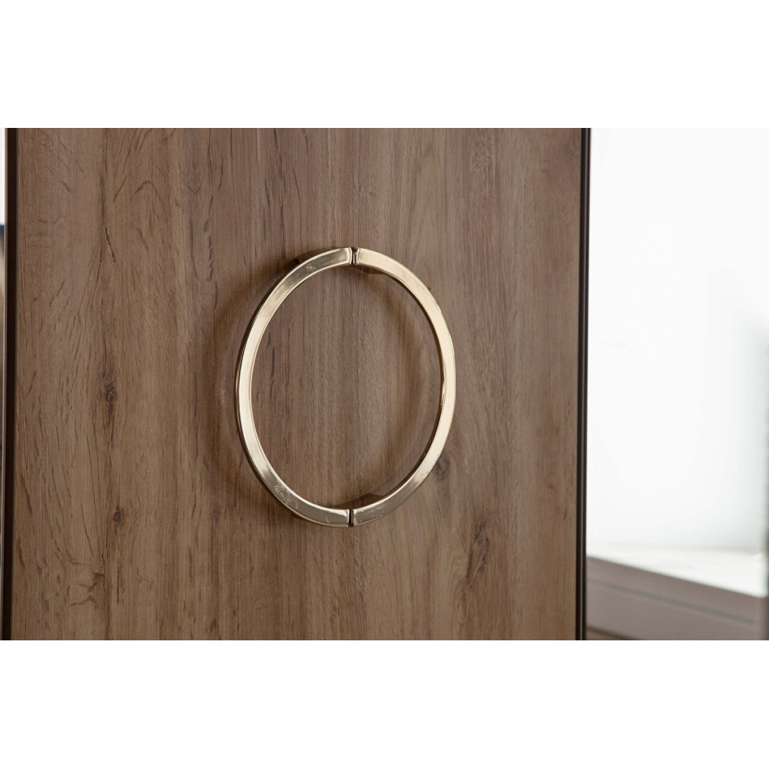 Шестистворчатый  шкаф Санвито SANV-34 длиной 2,710 мм  многофункциональный предмет вашего интерьера для хранения. Фасады шкафа  представлены в комбинации трех видов дверей. По центру выделяется пара дверок из  ЛДСП древесной фактуры с оригинальной круглой металлической ручкой. Рядом расположены зеркала на всю высоту шкафа, и завершают композицию кремовые  фасады с рифленой поверхностью. Углы шкафа имеют скругленные формы.
