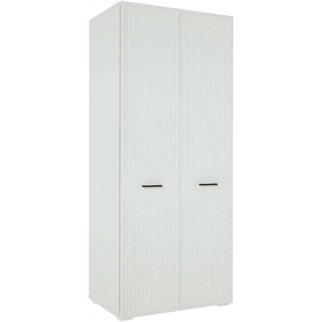 -Фасад выполнен из МДФ с декоративной фрезеровкой в виде вертикальных полос и окутаны плёнкой ПВХ цвета «Белый матовый»;